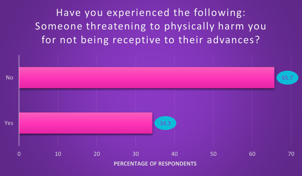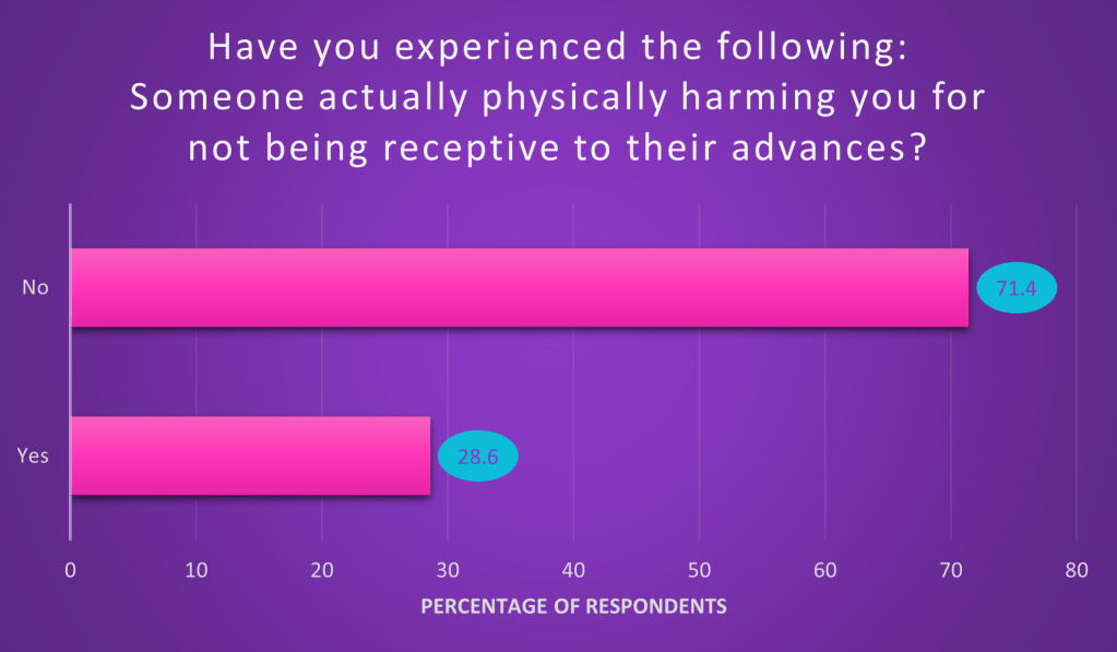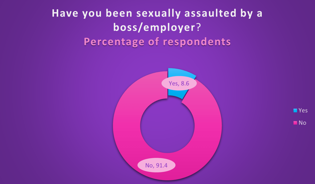 9 out of 105 respondents answered yes to being sexually assault by a boss, no one reported the assault as rape.