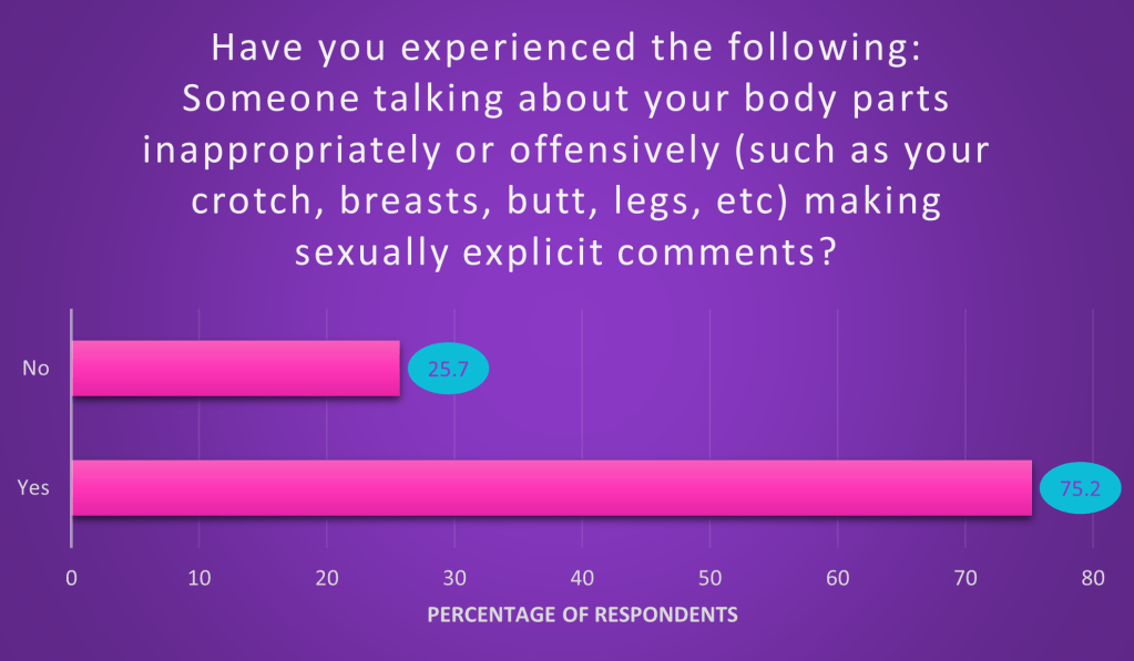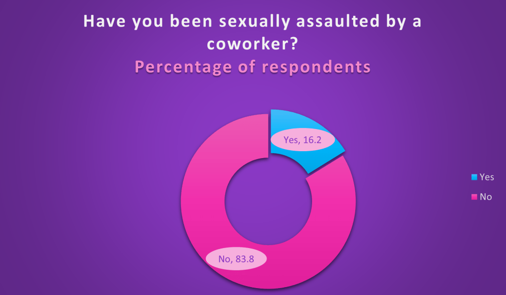 17 out of 105 respondents answered yes to being sexually assault by a coworker, and of those 17 only one stated that the assault was rape.