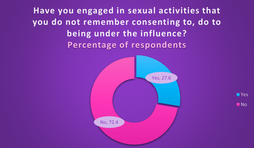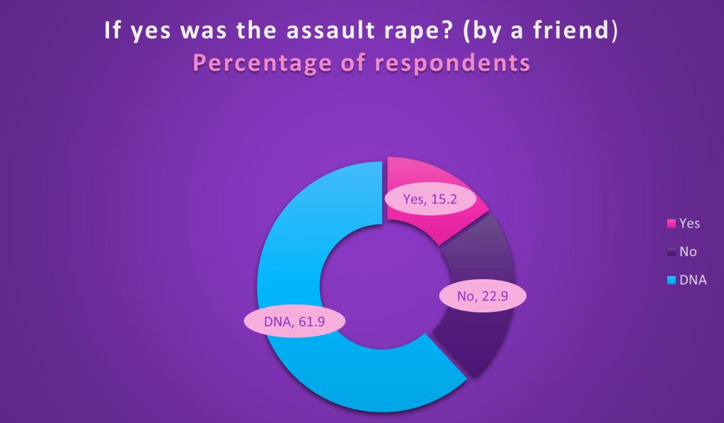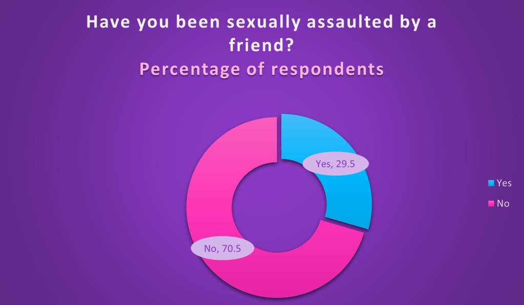 31 out of 105 respondents answered yes to being sexually assault by a friend and of those 31, sixteen said the assault was rape.