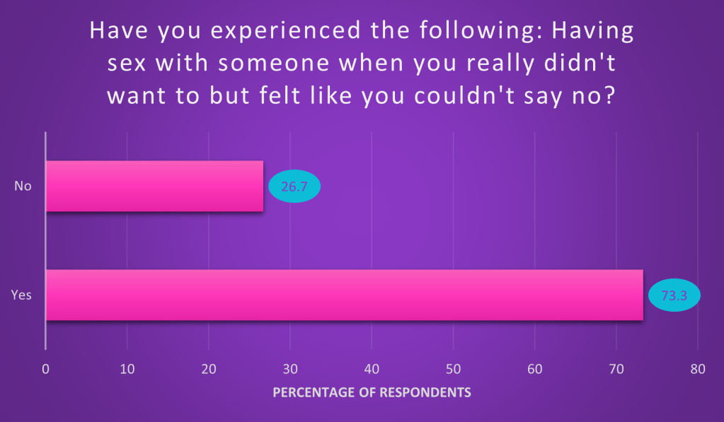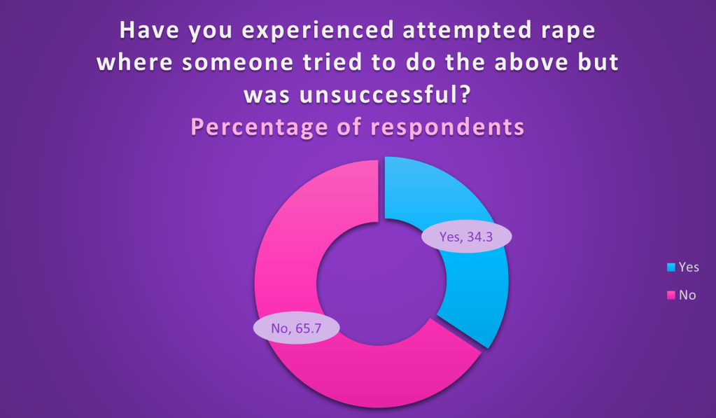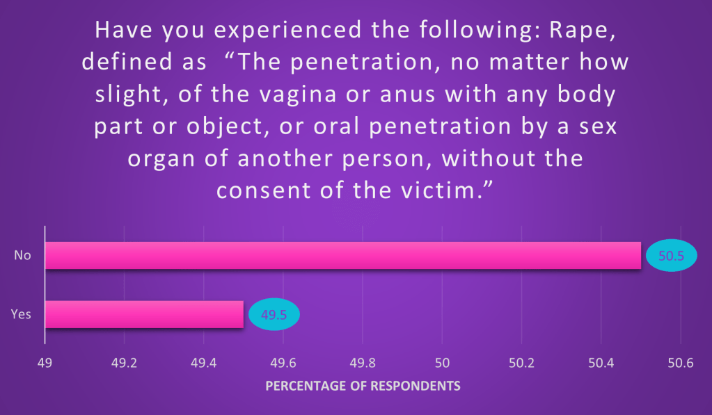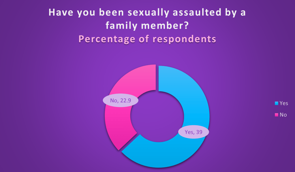 41 out of 105 respondents answered yes to being sexually assault by a family member and of those 41, seventeen said the assault was rape.