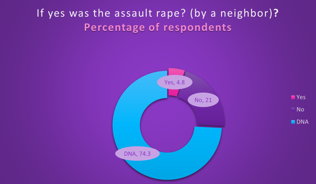 12 out of 105 respondents answered yes to being sexually assault by a neighbor, out of the twelve, five reported the assault as rape (42%).